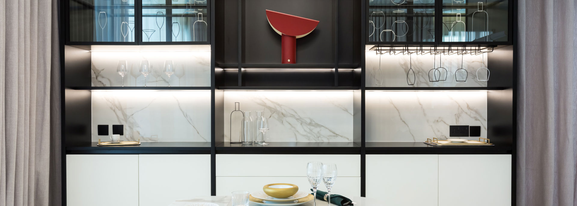 A modern crockery unit featuring a sleek black-and-white color scheme with a white stone backsplash. Glass-fronted cabinets on either side showcase the crockery. Integrated lighting highlights the display while adding a warm ambiance. A central open shelf creates a striking focal point.