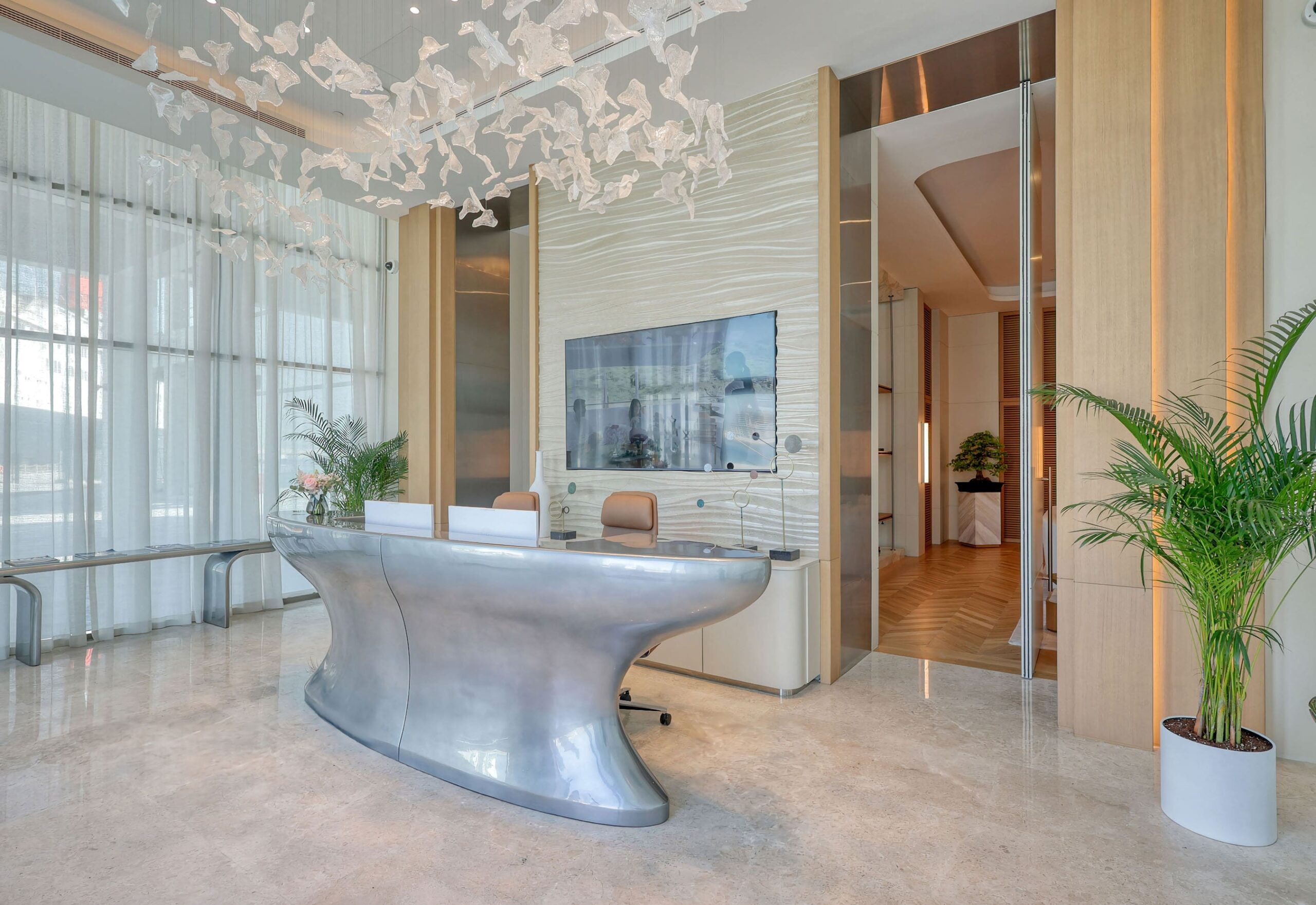 An impressive 745 sqm office at Port Rashid, showcasing outstanding craftsmanship and design. This full fit-out project was executed with precision and exceptional finishes. The key decorative element - entirely designed and handcrafted by the Finasi Joinery - is the reception counter, which replicates the bow of a ship, paying homage to the maritime heritage of the location.